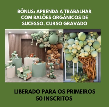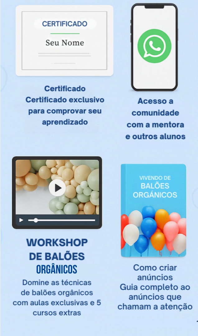 Grupo de apoio, Material em pdf, Curso Bônus Árvore de Balões, Cursos extras de Marketing e Vendas, Tabela de cores, Fornecedores, grupo de alunos e muito mais